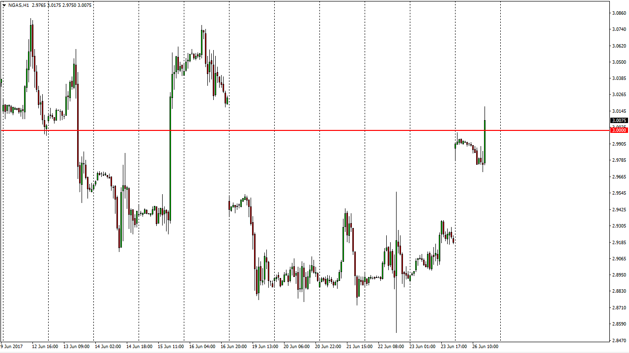 I’m looking for selling opportunities, plain and simple. Even though we had a massive gap higher I have no interest in trying to buy this commodity. Quite frankly, the oversupply continues to be a major issue, and will continue into the near future. I believe that we will start selling off rather soon, and therefore at the first signs of exhaustion, I’m willing to get involved and start selling. I have a target of $2.88 below, and then perhaps even lower than that. I have no interest whatsoever in buying this market, there is simply far too much in the way of supply to keep this market going higher for any real length of time, so I believe that this is offering a nice opportunity. I will be selling rather soon, and at the first signs of trouble. Buying simply is not an option anytime soon.