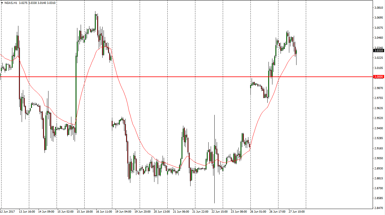Natural gas markets went sideways during the day on Tuesday, as we continue to see quite a bit of interest in this market. The $3 level is looking like it is trying to offer support, and of course the 24-hour exponential moving average on the chart is showing signs of support as well. If we can break down below the $3.00 level, then I think we go down to fill the gap. Longer-term, we are most certainly in a negative downtrend, so I think that it is only a matter of time before we break down. If we did manage to break above the 3.08 level on a daily close, then I would be a buyer, at least short-term. There is a significant amount of resistance above. Ultimately, I think that the market reaches down to the $2.88 level, to test significant support underneath.