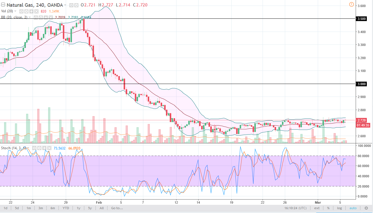Natural gas markets have gone back and forth during the trading session again on Monday, as we hang about the $2.70 level. We have recently sold off rather drastically, and that of course continues to be an issue that keeps buyers away. It makes sense though, because the recent shock would of course make it difficult to imagine a scenario where you would be buying the natural gas market. I think that the oversupply will continue to be a major issue, as Americans are coming out of colder weather, so that should continue to put bearish pressure on this market as it’ll bring down demand.