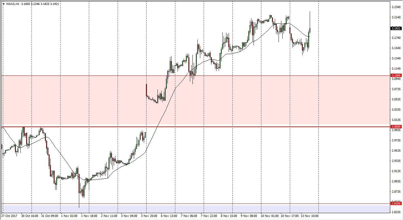 Natural gas markets gapped lower at the open on Monday, and then dropped down to the $3.15 level to find support. We bounce from there and filled the gap next, forming a bit of a shooting star on the hourly chart. It’s possible that we could pull back from here, but I expect the $3.10 level to offer support. If we can break above the top of the shooting star on the hourly chart, essentially the $3.23 level, the market should continue to go much higher and continue the uptrend. I believe that’s what will happen eventually, the question is whether we get that move right away, or do we get a pullback offering value? While I am very negative on natural gas longer-term, I recognize that with the short-term seasonality coming back to the markets, it makes sense that natural gas will continue to strengthen. Temperatures are getting colder in the United States, and that should offer plenty of reason for the buyers to become optimistic, at least until January.
