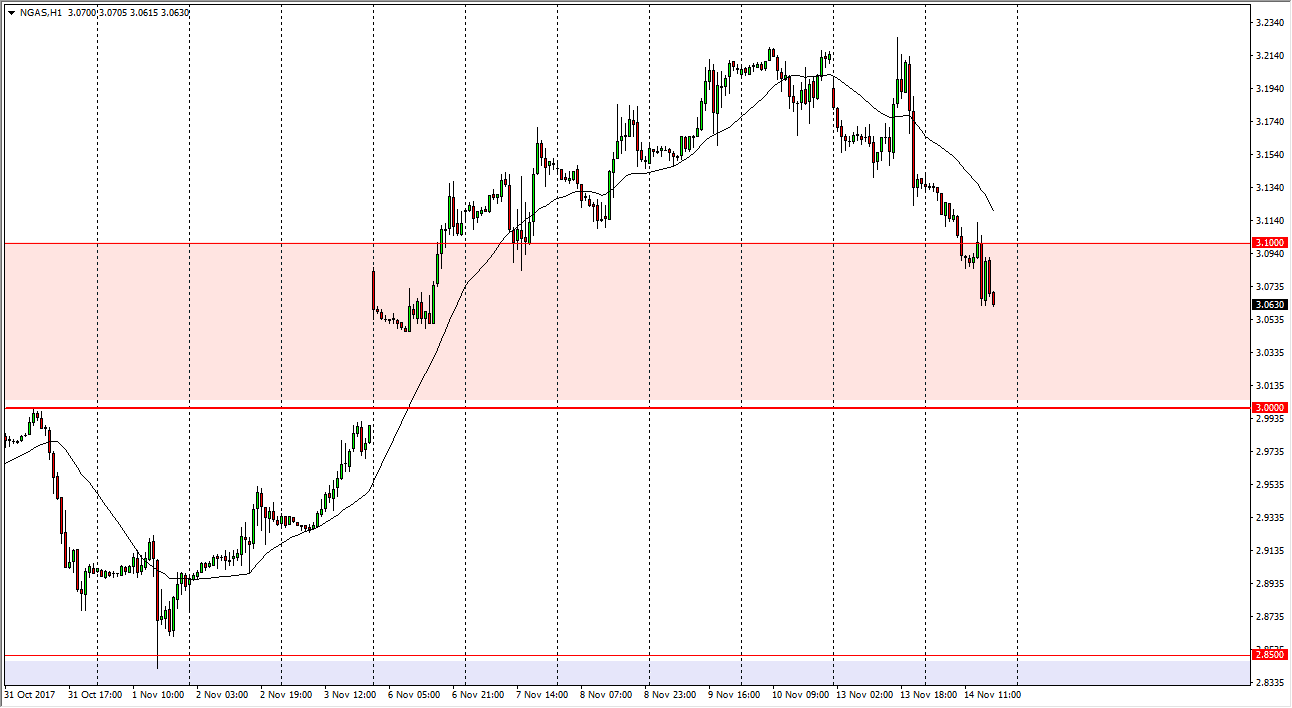 The alternate scenario is a breakdown below the $3 level, and if we do, the market could go to the $2.85 level after that. This market continues to be very choppy and noisy, but quite frankly I think that the bullish pressure underneath continues to mount, as we should continue to see more “buy the dips” mentality. At this coincides with falling temperatures in the northeastern part of the United States, which of course is to be expected. However, by the time January rolls around, it’s likely that the market will roll over again and start focusing on the oversupply that we have seen for some time. Overall, this is a market that you need to be very careful with, because of the liquidity issues that we face at times. Using CFD markets will be the best way to deal with this, as futures markets could get very dangerous at times.