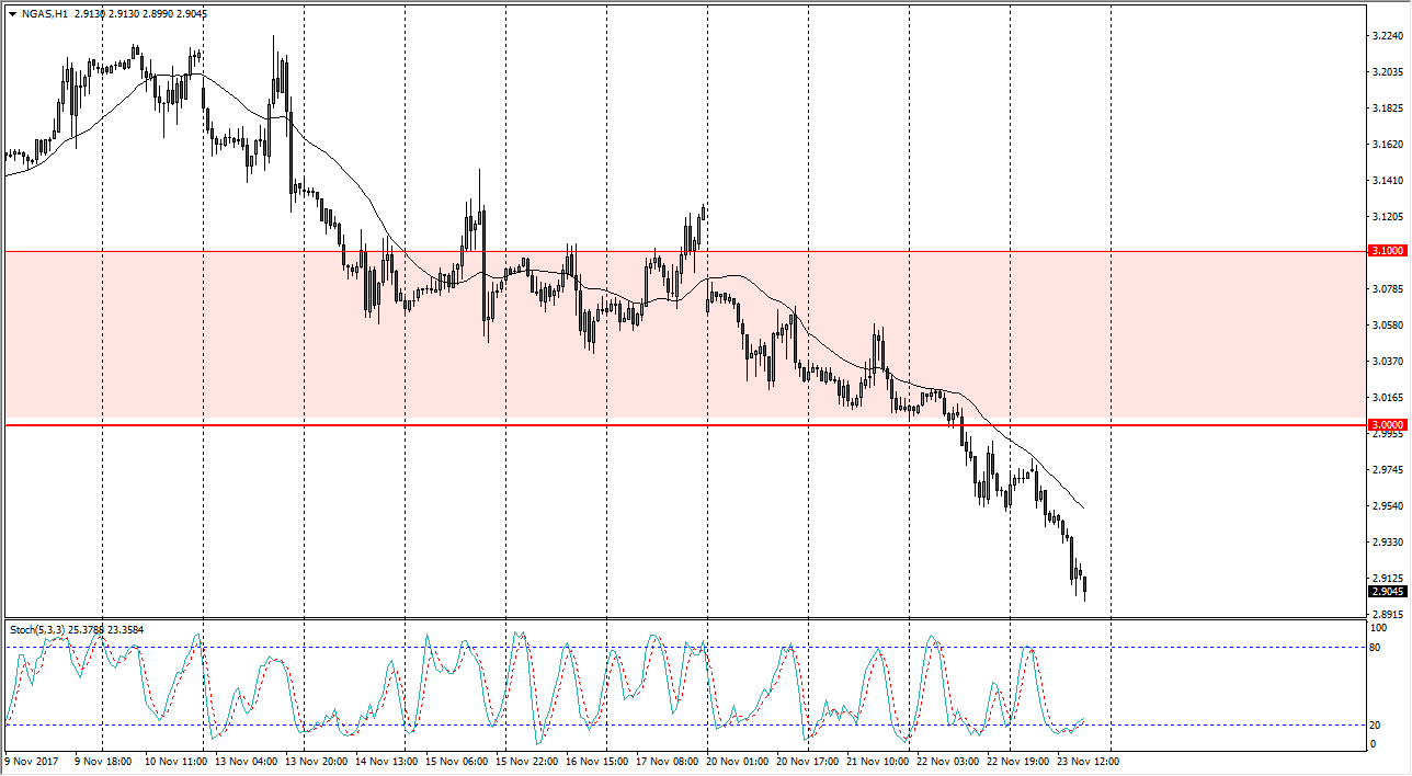 Natural gas markets have broken down significantly during thin trading on Thursday, as American traders were a way for Thanksgiving. However, the market breaking down below the $3 level previously was an extraordinarily negative sign, and quite frankly a surprising one considering that the seasonality of natural gas is calling for higher pricing right now. If we cannot keep the market afloat at this point, I don’t see what does. I look at rallies as selling opportunities, as the longer-term outlook for natural gas course is negative, but the demand normally picks up enough to keep the market afloat during the November and December trading session. I think that we will probably go looking towards the $2.85 level underneath, which has been support in the past.