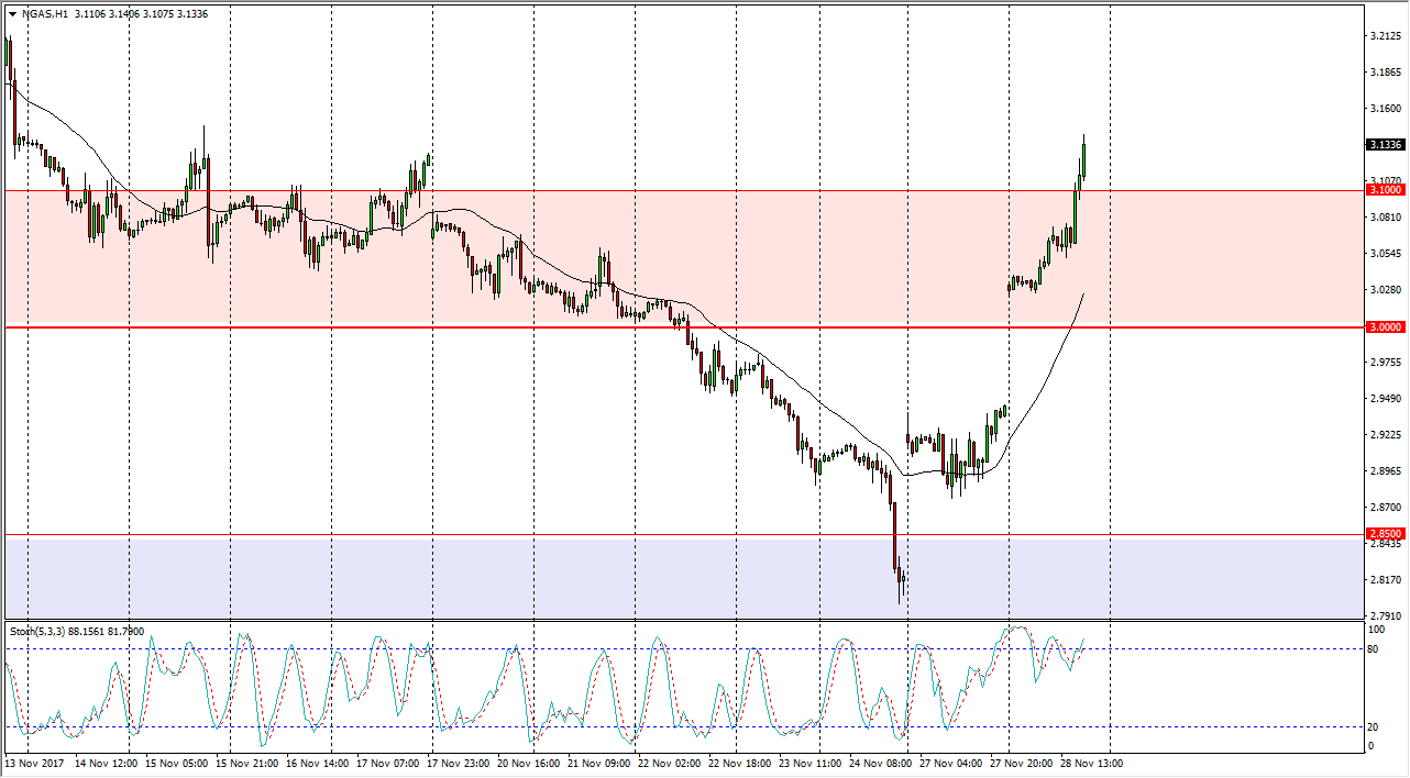 The natural gas markets gapped higher at the open on Tuesday, breaking above the $3 handle. Again, natural gas has proven itself to be thin and illiquid