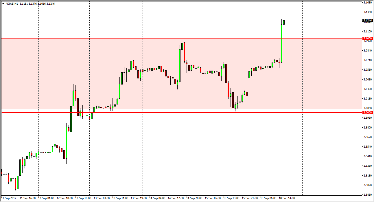 Natural gas markets gapped higher at the open on Monday, and then later in the day finally managed to slice through the $3.10 level. Because of this, and the fact that we have already pulled back to test that area for support, I believe that the natural gas markets are going to continue to go higher. This is a major breakout, and I believe that the $3.20 level above will be the short-term target. Short-term pullbacks should continue to be buying opportunities if we can stay above the $3.10 level, as the market has shown such bullish pressure and of course has cleared a massive barrier. On the other hand, if we fall below the $3.10 level, then I believe we will probably continue to see choppiness. I am not interested in shorting until we can break below the $3 level though, which is not going to happen today more than likely. Because of this, I believe that the volatility should continue to be intense, especially after the hurricane issues that we have had in the Gulf of Mexico, and the new hurricane that’s forming.