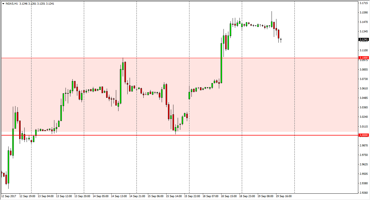 With the recent breakdown in the natural gas markets, it’s very likely that the market will test the $3.10 level for support. As that level has been massive resistance, it makes sense that we will need to test this region for stability. If it holds, it’s very likely that the market will bounce towards the $3.20 level above. While I believe longer-term we have issues with oversupply, it’s likely that the short-term momentum should continue to send this market higher. Ultimately, I believe that this market will continue to be very volatile, and most of the noise will be somewhat unbearable for those who are overleveraged. Because of this, we may be likely to see sudden and drastic moves.
