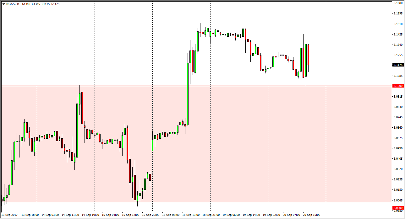 Natural gas markets have been very volatile during the Wednesday session, as we have tested the $3.10 level for support. So far, it has held, which is what you would expect after a significant break out like we had a couple of sessions ago. At this point in time, I would suggest that perhaps that area should be an area that buyers are interested in, and that we should eventually grind higher. However, if we were to break down below the $3.10 level, we could go as low as $3.02 to fill the gap from 3 sessions ago. I think the one thing you can count on in the short term is going to be volatility, as a natural gas markets tend to be so anyway. This recent breakout has been significant, and I have more of an upward bias in the short term, although longer-term I thesis has not changed: we have a massive oversupply in this market.