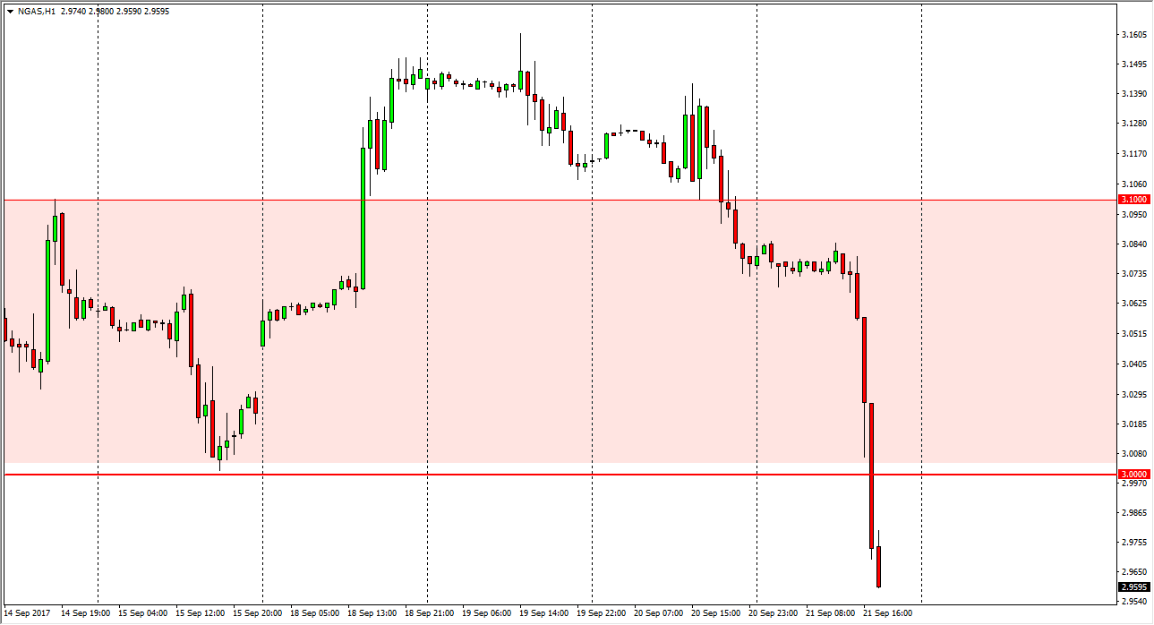 Natural gas markets continue to be very volatile, and absolutely cratered during Thursday trading, breaking well below the $3 level as the inventory number came out larger than anticipated yet again. This is a market that every time it rallies, it has issues keeping those gains. We even managed to break above the vital $3.10 level recently, but now that is in the rearview mirror. Now that we are below the $3 level again, the sellers will probably come out on every rally, as even with hurricanes causing disruptions, natural gas supplies continue to be very large and under estimated. This has been a running theme for the last several years, and the market continues to be fooled.