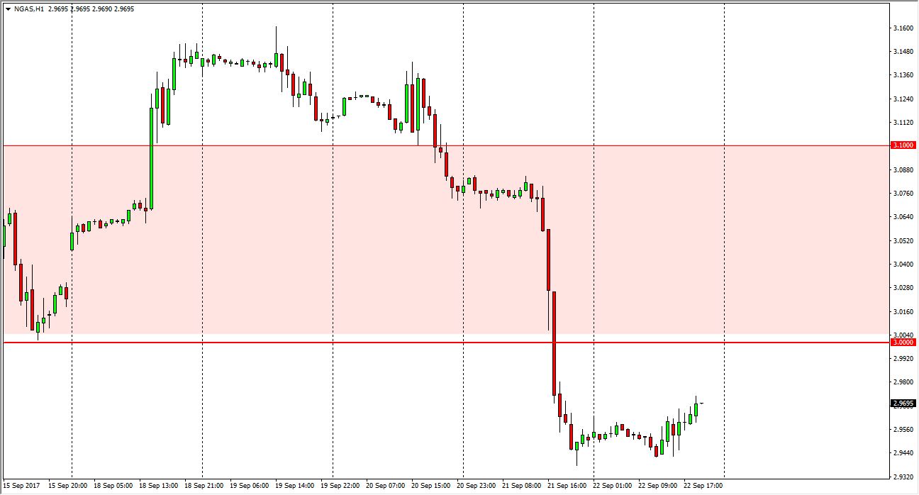 Natural gas markets went sideways during most of the session on Friday, but found a bit of support near the $2.94 level. By bouncing slightly, it looks as if we could go trying to test the $3 level above. However, I think that’s an area that will offer resistance, as it had been so important in the past. I think the given enough time, we will probably find sellers coming back into this market that had sold off rather drastically, as the inventories continue to build, even with hurricane damage. If we cannot build up value in the natural gas market right now, I don’t know when we can. Because of this, I remain bearish, and even though we broke above the vital $3.10 level recently, the buyers have all but abandoned this market. I find this particularly telling, and quite frankly I think that the volatility has done a great disservice to many people in this market. Given enough time though, I think that clarity will return, and that a “cell the rallies” type of attitude returns.
