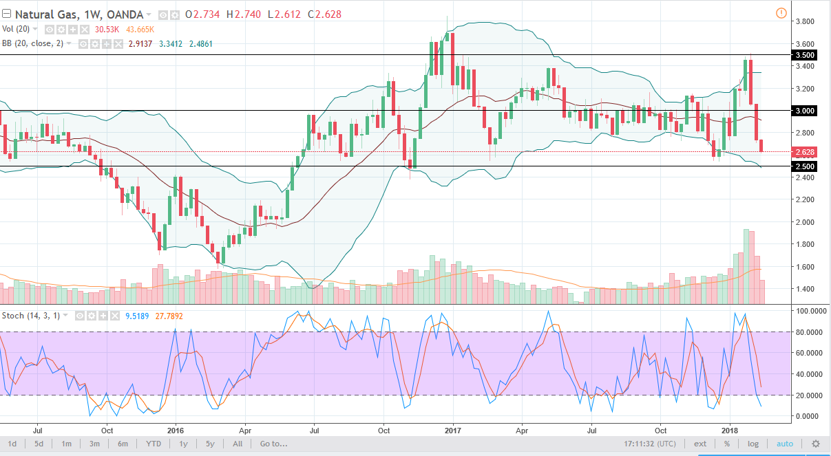 The alternate scenario is that we break down below the $2.40 level, which would be the bottom falling out of the natural gas markets. I am reading headlines that 2018 may be the year that we break all records in the United States drilling for natural gas, so oversupply isn’t much of a question, it’s just a question of how drastic is it? Ultimately, I think that buying this market is impossible, and reckless to say the least. Short-term traders may try to time the market, but the longer-term trader should recognize that buyers simply cannot hang on to gains for any length of time.