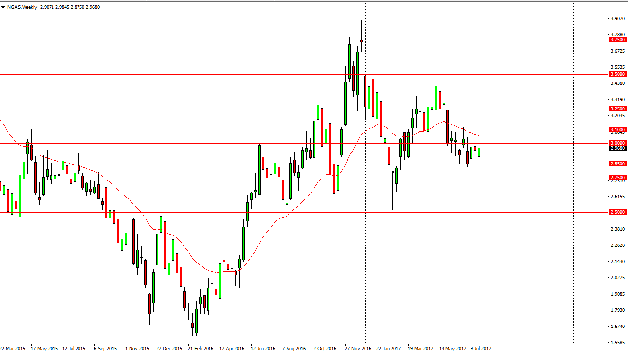 The natural gas markets fell during the week at the open, but then spent the rest of the week trying to fill the gap. We did in fact do so, and we ended up forming a green candle, although just barely. The $3 level above continues to offer a significant amount of support, so I believe that it is only a matter of time before the buyers get involved and test the $3 handle again. However, I recognize that there is a significant amount of resistance at the $3 level, that extends to the $3.10 level. Because of this, I am a bit hesitant to buy, but I am more than willing to sell rallies.