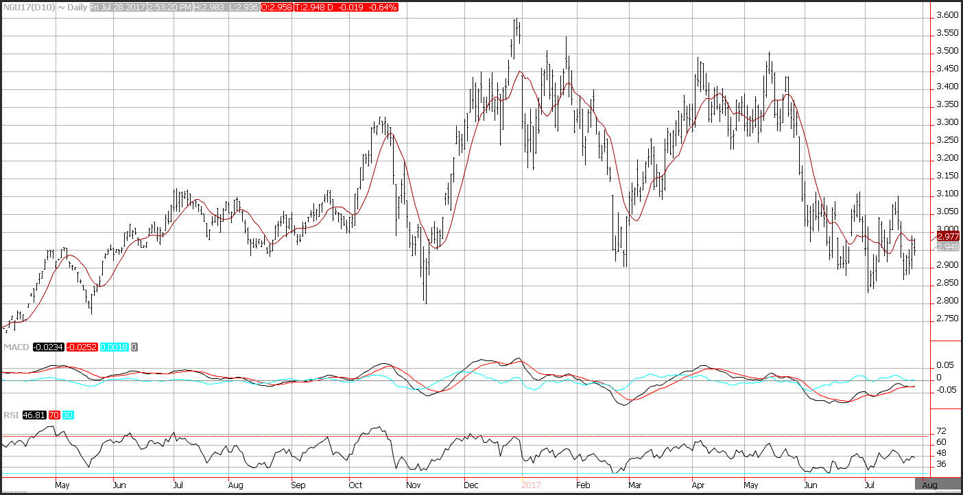 Natural gas prices were lower on Friday, as cooler than expected weather in the middle of the Uninted States over the next 2-weeks is weighing on natural gas demand. This has been offset by strong demand in California. Prices ran into resistance near the 10-day moving average at 2.98. Support is seen near the weekly lows at 2.88. Momentum is neutral as the MACD (moving average convergence divergence) histogram prints near the zero index level with a flat trajectory which reflects consolidation.