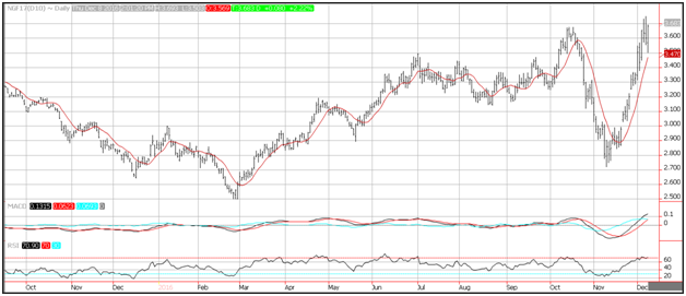 According to the Energy Information Administration, working gas in storage was 3,953 Bcf as of Friday, December 2, 2016. This represents a net decline of 42 Bcf from the previous week, which was in line with expectations. Stocks were 51 Bcf higher than last year at this time and 254 Bcf above the five-year average of 3,699 Bcf. At 3,953 Bcf, total working gas is above the five-year historical range.