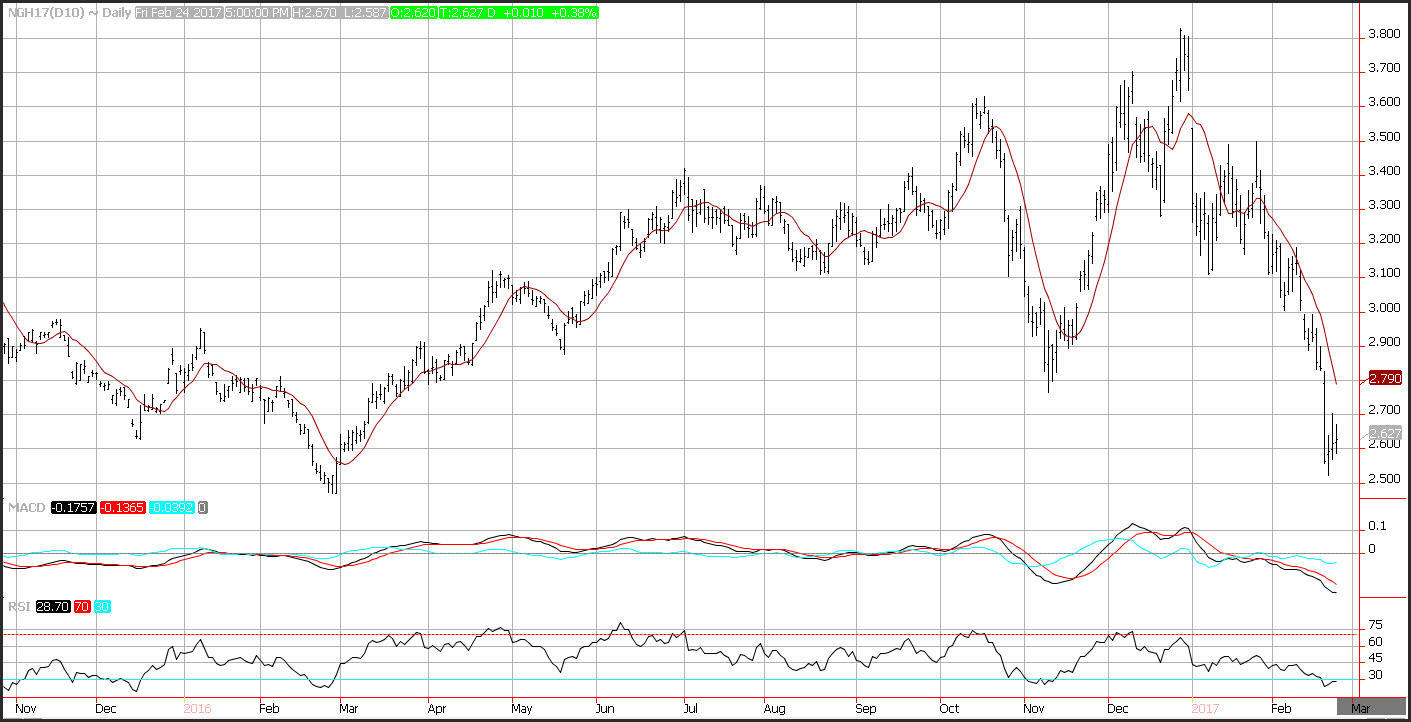 Support is seen near the weekly lows at 2.52. A break of this level would lead to a test of target support near the February 2016 lows at 2.47. Momentum remains negative as the MACD (moving average convergence divergence) index prints in the red with a downward sloping trajectory which points to lower prices. The relative strength index (RSI) is printing a reading of 29, below the oversold trigger level of 30 and could foreshadow a correction.