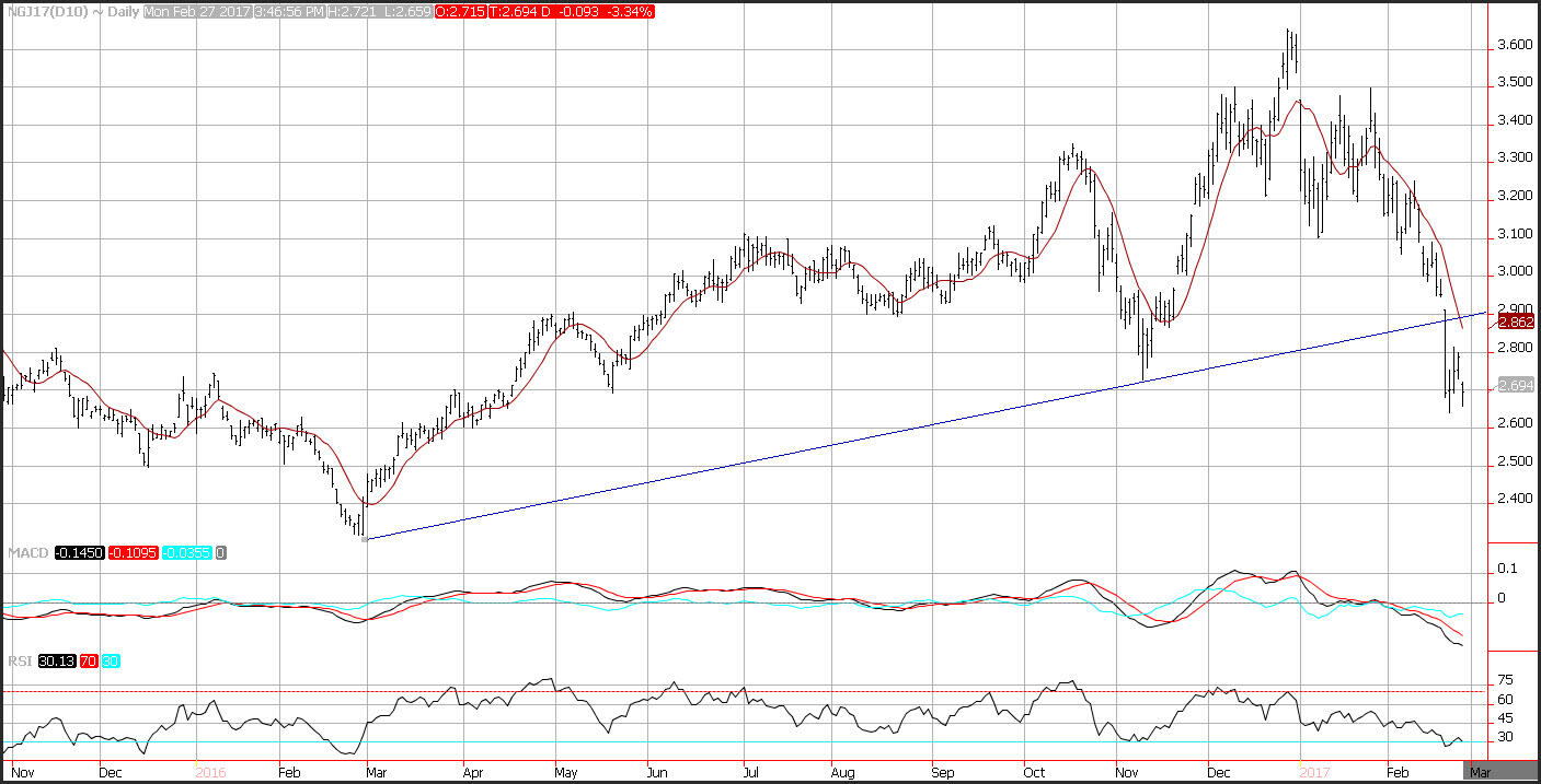 Prices sliced through trend line support which is now seen as resistance near 2.86, which coincides with the 10-day moving average. Support is seen near 2.65, and then the February 2016 lows at 2.35. Momentum remains negative as the MACD (moving average convergence divergence) index prints in the red with a downward sloping trajectory which points to lower prices. The RSI (relative strength index) is printing a reading of 30, which is on the oversold trigger level and could foreshadow a correction.