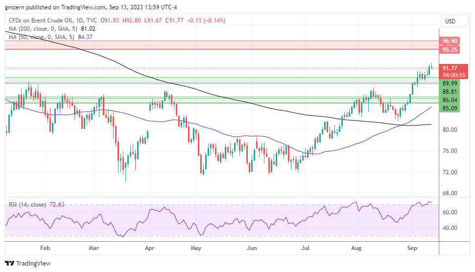 RSI is in the overbought territory, so oil markets may be sensitive to any news that could be interpreted as bearish.