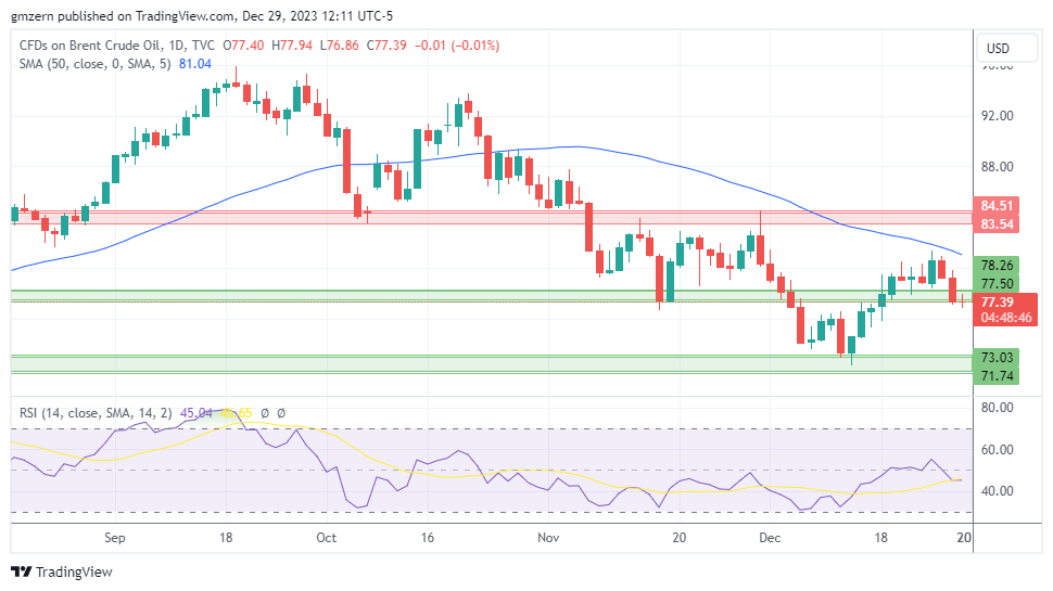 If Brent oil manages to settle back above the support at $77.50 – $78.25, it will move towards the 20 MA at $81.05.