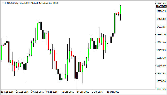 The Nikkei 225 initially fell slightly during the course of the session on Monday but turned around to explode to the upside. At this point in time, looks as if the Nikkei 225 market is ready to continue going higher, perhaps reaching towards the ¥17,500 level. Pullbacks at this point in time should continue to be buying opportunities as we have obviously broken out to the upside, and with that being the case I feel that the market continues to look at pullbacks as value in a market that most certainly is supported by the Bank of Japan.