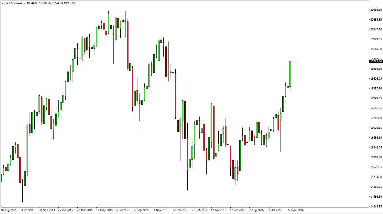 The Nikkei 225 continue to go higher during the week, as we have completely broken out to the upside. I believe that the USD/JPY pair continues to go