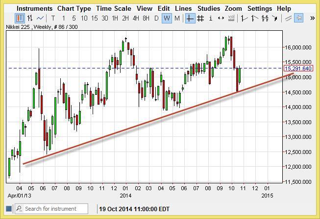 The Nikkei rose during the week, clearing the 15000 level again. With this, we feel that the market should continue to go higher at this point in time.
