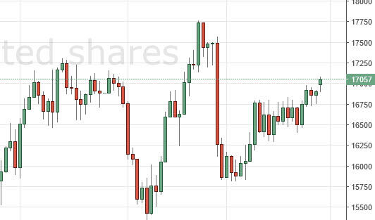 The Nikkei gapped higher at the open on Monday, as the market shows continuing bullish pressure. If we can break above the top of the candle, we should continue to go higher, but at this point in time we think that pullbacks will more than likely be found to be value as well. After all, the ¥16,750 level was previously resistance, so it should now be support. Ultimately, we believe that this market is going to continue to go higher, reaching towards the ¥17,750 level. We have no interest in selling this market right now due to all of the noise below.
