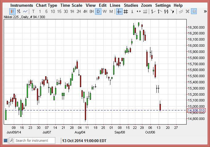 The Nikkei gapped lower at the open on Tuesday, breaking below the ¥15,000 level. With that, the market was very bearish all of a sudden, and a move below