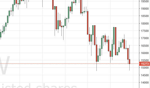The Nikkei went back and forth during the course of the week, initially going to the ¥16,500 level. We turn right back around to form a shooting star of sorts though, as we continue to sit on the ¥15,000 level. That’s an area that offers quite a bit of support, so if we can break down below there, I feel that the market will probably drop to the ¥14,000 level, and then possibly the ¥12,500 level. On the other hand, if we could break above the ¥16,500 level, the market could go much higher at that point in time.