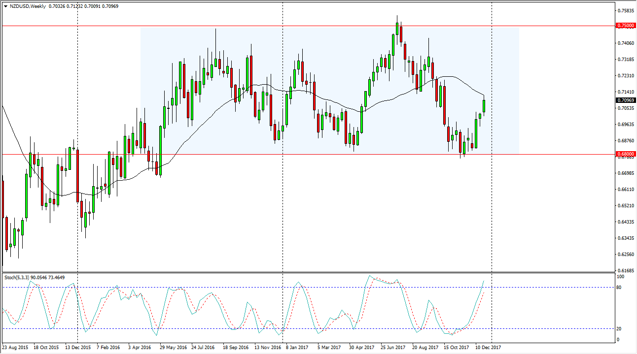 The New Zealand dollar formed a positive candle during the week, reaching towards the 0.7150 level, before giving back some of the gains. The kiwi dollar has reacted positively to some slightly hawkish comments coming out of New Zealand, after the massive selloff in reaction to the Labour Party being sent into power. When you look at the chart, you can clearly see there is a consolidated area that extends from the 0.68 level on the bottom to the 0.75 level on the top. I think that ultimately, we could go back towards the 0.75 level, but it is going to take some time to get there.
