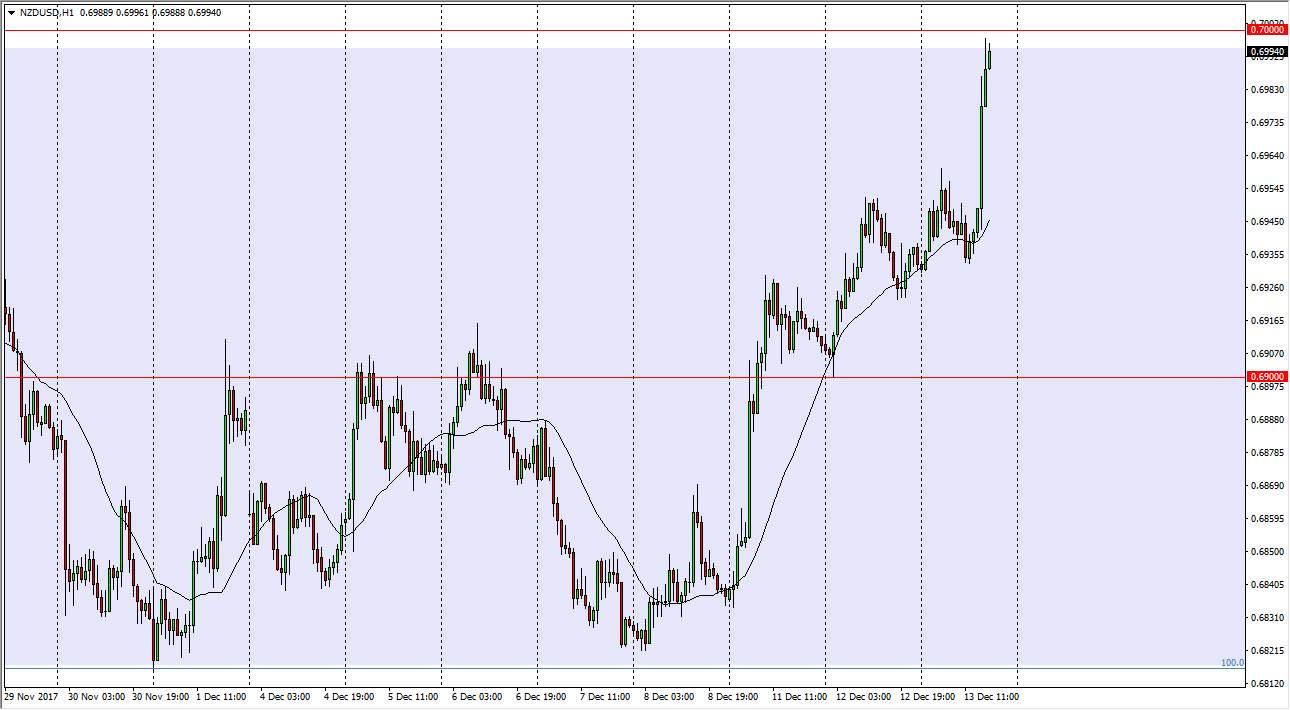 The New Zealand dollar was initially choppy during the trading session on Wednesday, as we await the Federal Reserve announcement, and more importantly the statement. We have a started to rally towards the 0.70 level, an area that is massively resistive. Most of this reaction would have been due to Senator Flake suggesting that he was still questioning whether to sign the tax bill in the United States, putting tax reform in real jeopardy. Much of the US dollar rally has been due to the idea of tax reform, and therefore we could see a complete reversal of the trend if it does not happen. If we can close above the 0.70 level on the daily chart, the New Zealand dollar would break out of this short-term consolidation, and perhaps go looking towards the top of the longer-term consolidation which is near the 0.75 handle.