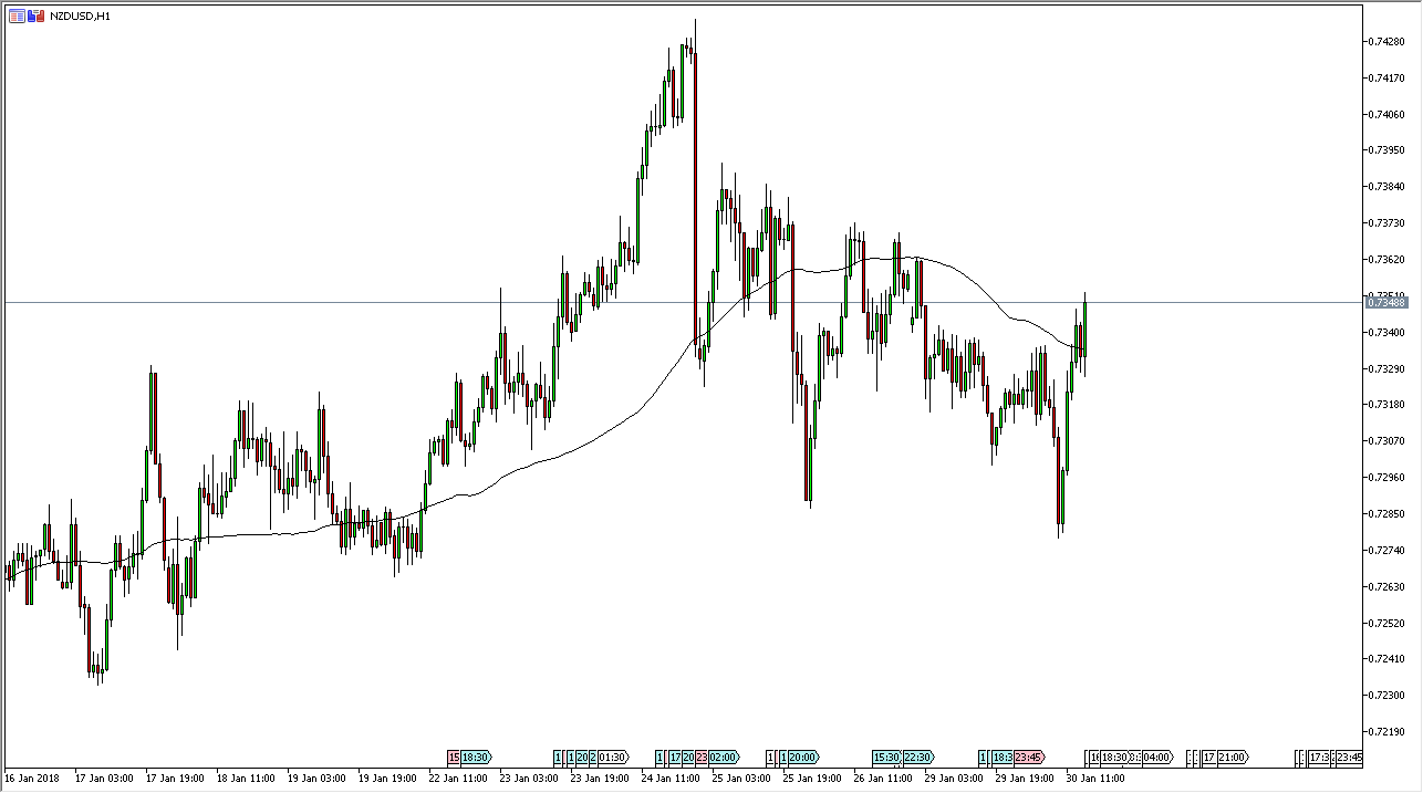 The New Zealand dollar has bounced significantly from the 0.7275 level, reaching towards the 0.73 level on Tuesday. However, we are in the middle of a lot of noise, and I believe that the market should continue to be very positive longer-term, but difficult to deal with for short-term traders.