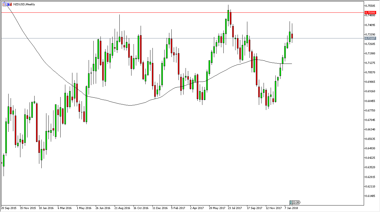The New Zealand dollar initially tried to rally during the week but turned around to form a bit of the shooting star. The shooting star of course is a negative sign, and I think that we may get a bit of a pullback. A breakdown below the bottom of that weekly candle stick should send this market down to the 0.72 level, and then possibly the 0.70 level next. Alternately, if we can break above the top of the candle, the market would probably go looking towards the 0.75 level above, which is a massive barrier. A break above there census market much higher for the longer-term and gives us more of a “buy-and-hold” attitude in this market, and perhaps the opportunity to buy the pullbacks as they occur.