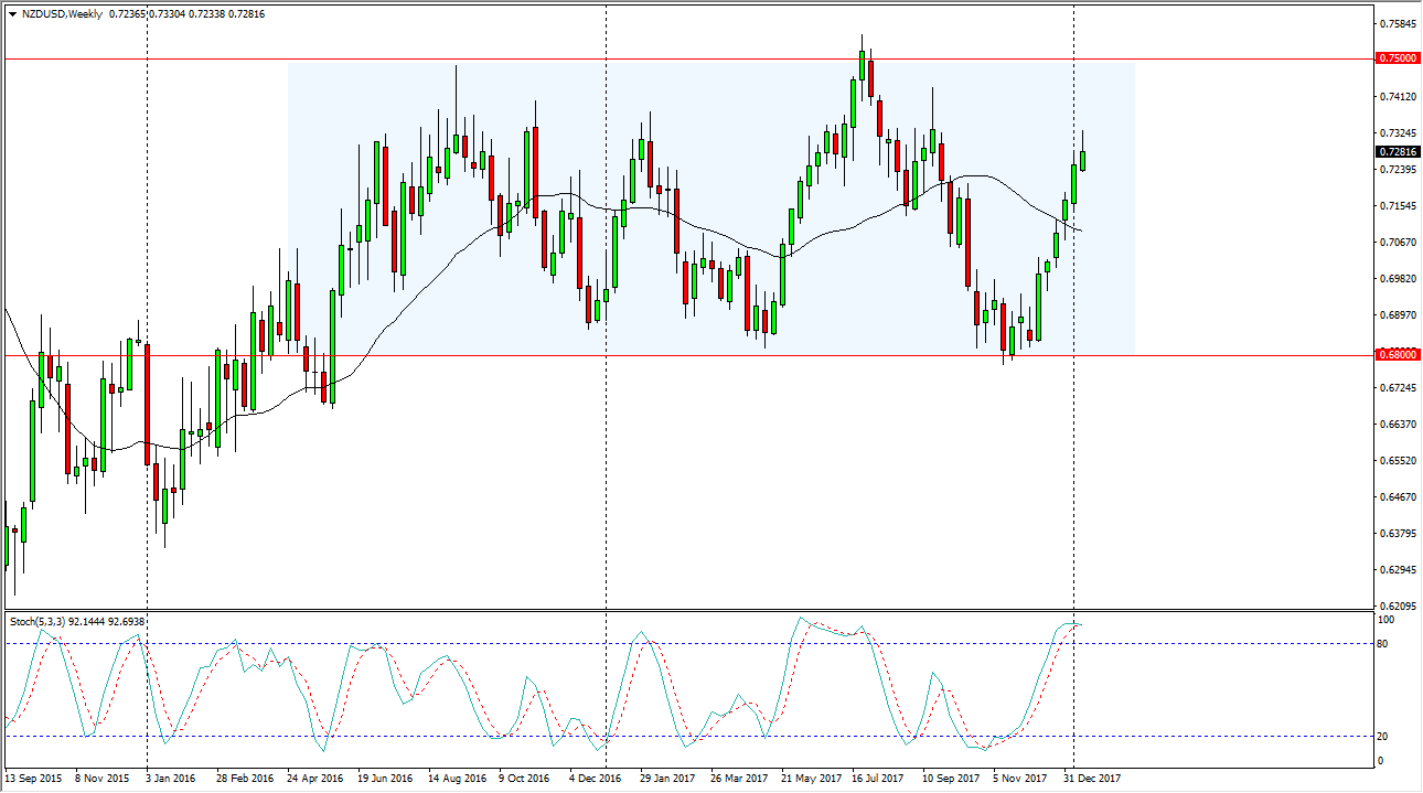 The New Zealand dollar rallied again during the week, breaking above the 0.73 level, but as you can see on the weekly chart, there has been a difficult move to break above the 0.74 level, and I think at the resistance will start to come into play. The weekly candle is green, but it has given back about half of the gains, which of course isn’t necessarily the strongest sign. Because of this, I think we are going to see the markets rollover rather soon, but I’m not looking for some type of collapse, just simply a pullback. When you look at the stochastic oscillator on the weekly timeframe, the moving averages are not only in the overbought condition, but they are starting to cross. Because of this, I think we are going to see the market drop.