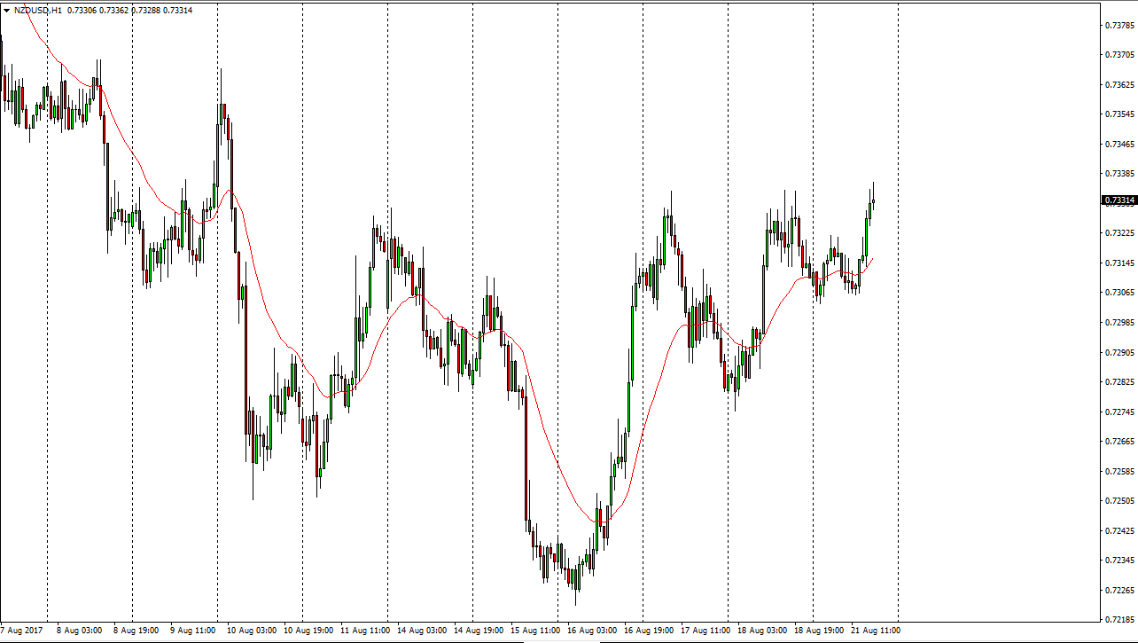 The New Zealand dollar was very choppy during the session on Monday, but found quite a bit of interest during the American trading session. It looks as if were going to go looking towards the 0.7350 level, and a break above there could be rather bullish. At that point, I expect the market to go looking towards the 0.75 level over the longer term. However, on the hourly chart it looks like we may have a bit of a struggle ahead of us, so it’s possible we get a pullback. That pullback should be buying opportunity if we can stay above the 0.73 handle underneath. Expect choppiness, but overall I expect to see buyers eventually take over.