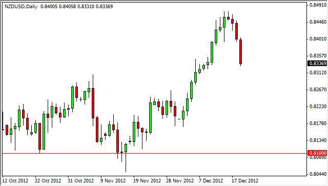 The NZD/USD pair had a very negative session on Wednesday as the “risk off” trade came back into play for the session. We think part of this is predicated upon the so-called “fiscal cliff” talks in the United States, and the fact that they seem to be going nowhere fast. If that’s the case, the United States could go into a recession, and this would of course put a severe beating on risk assets around the world. I can think of no currency units traded with relatively high frequency that represents “risk on” more than the New Zealand dollar. Because of this, it makes sense that the pair fell. However, we do see digital for significant support at the 0.83 handle, as well as several levels below. Because of this, we are not interested in selling, but would rather buy a supportive looking candle at one of the big round numbers below.