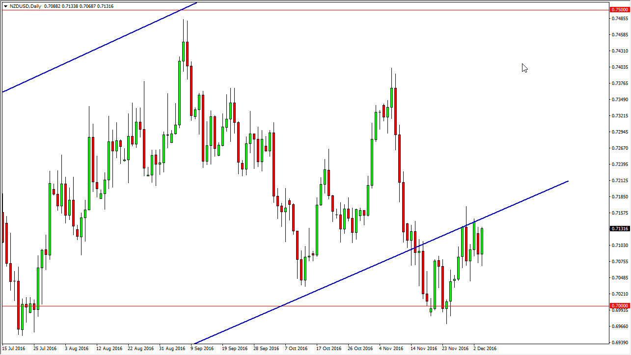 The New Zealand dollar initially fell slightly during the day on Monday, but then shot higher and tested the bottom of the uptrend line that we have been