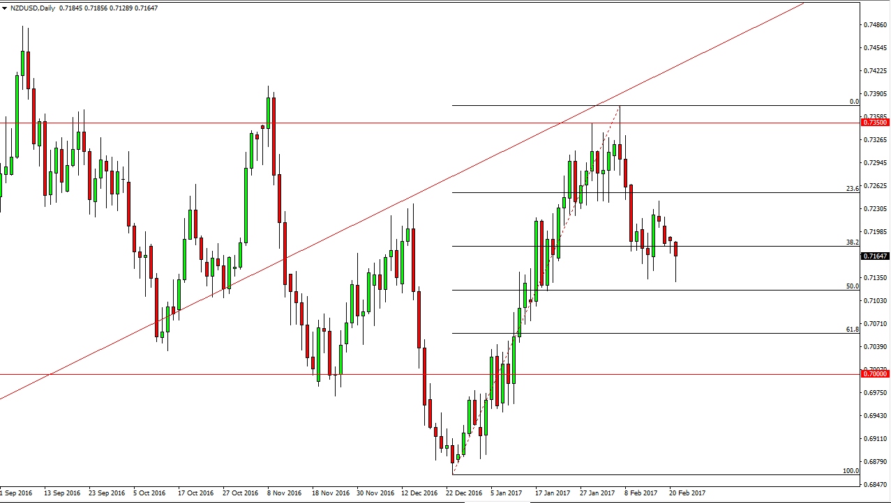 The New Zealand dollar fell initially during the day on Tuesday but found enough support near the 50% Fibonacci retracement level to turn things around and form a hammer. That of course is a bullish sign, and a break above the top of the candle during the day should send this market looking for the 0.7250 level above. I think we will eventually reach towards the 0.7350 level also, but pay attention to the commodity markets as the New Zealand dollar seems to be a general barometer of how things are going over there. The higher they go, the higher this pair goes.