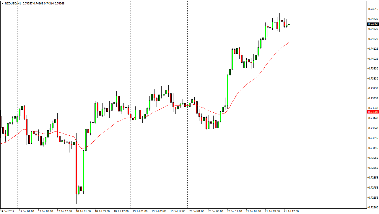 The New Zealand dollar rallied during the day on Friday, as we continue to follow the 24-hour exponential moving average. The market tested the 0.7450