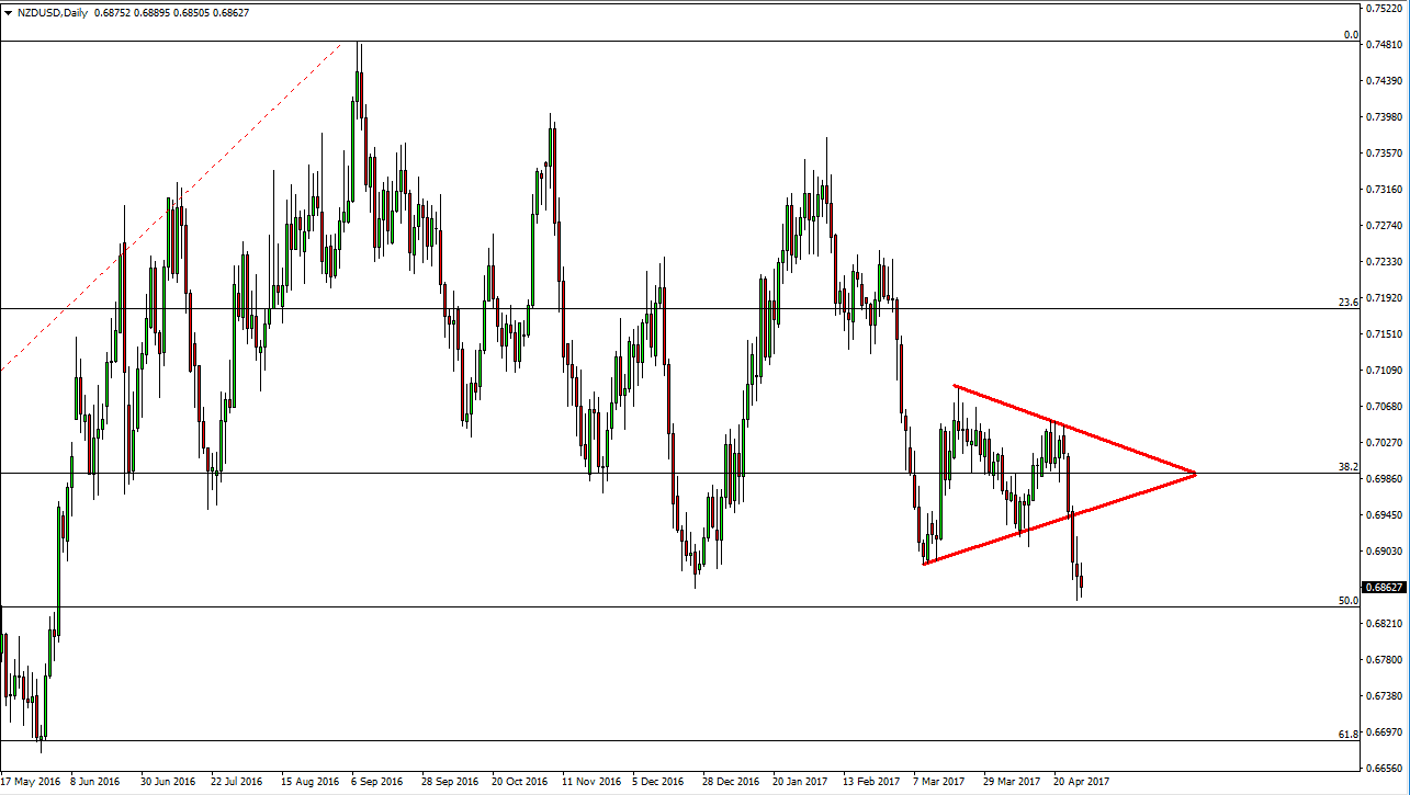 The New Zealand dollar fell slightly during the day on Friday as we continue to see support at the 50% Fibonacci retracement level. The 0.6850 level continues to be supportive, as it was resistive in the past. If we can break down below there I think that the market will drop down. A bounce from here should send the market towards the bottom of the symmetrical triangle that we broke down below, where I would expect to see resistance. This will be a very interesting market, but currently it looks as if it is negative.