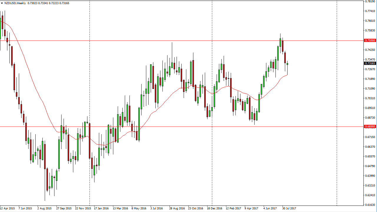The New Zealand dollar initially fell during the week but turned around to form a massive hammer at the 0.73 level. The New Zealand dollar had recently
