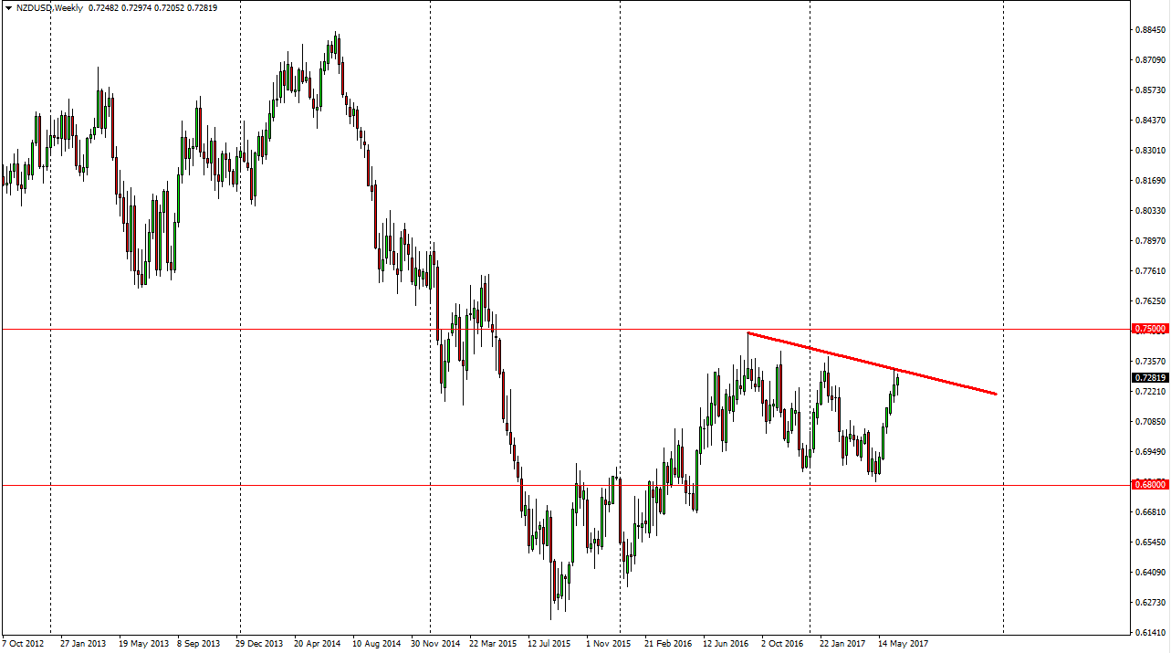 The New Zealand dollar initially fell during the week, but found enough support underneath to turn around and form a bullish candle. The bullish candle is testing a downtrend line, but if we can break above that I think that the market should then go to the 0.75 handle. Ultimately, this is a market that should continue to find buyers on dips, and if we can break above the 0.75 level, we should continue to go even higher. I don’t have any interest in trying to find the uptrend, so if we dip, I’ll be looking for buying opportunity. I do recognize that we are bit overextended during the last month, so it might be best to leave this market alone until we get the impulsive move to the upside or perhaps a significant pullback that finds buyers.