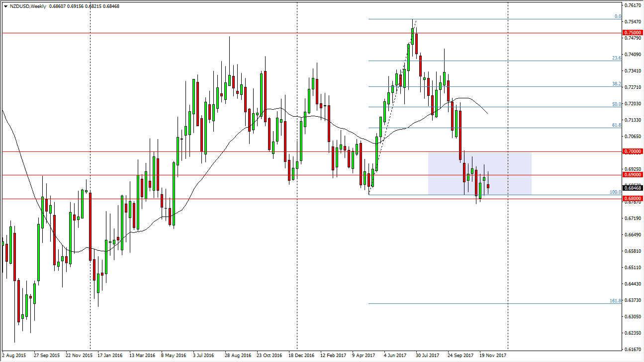 The New Zealand dollar had a choppy week, bouncing back and forth in multiple moves. At the end of the week though, we had formed a negative looking candle, and I believe we are trying to break down below the vital 0.68 handle. Once we do break down below that level, as I believe that the market is going to continue to go much lower, perhaps down to the 161.8% Fibonacci retracement level, which is closer to the 0.6375 handle. That’s not to say that is can be easy to get down there, and we most certainly will have the occasional bounce, but it appears to me that the relentless selling in this pair continues, and that rallies continue to offer selling opportunities. In fact, it’s not until we break above the 0.70 level that one can make the argument to go long of this pair for any significant amount of time.