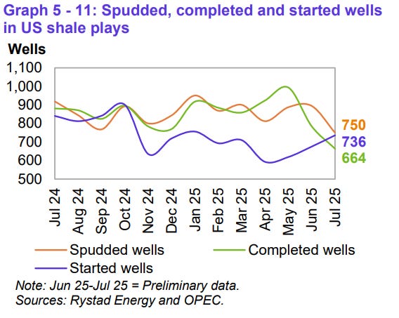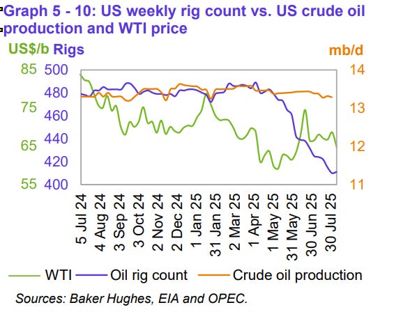 A mild slowdown in E of E&P (Exploration and production) activity. With job layoffs hitting the large oil companies, the industry is doing a lot more with a lot less people and expenditure. This new age of A.I. helping to accelerate this change. The charts as below illustrate this. All sourced from the OPEC August monthly report.