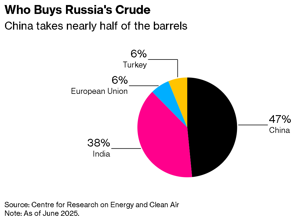 Fresh U.S. sanctions against Russia sent crude prices surging over 4%, though the rally quickly lost momentum as traders questioned Trump’s resolve and Kuwait’s oil minister poured cold water on the move. The sanctions carry more symbolic weight than real disruption, with Russia’s vast “shadow fleet” still moving barrels under the radar. Yet the announcement reshuffles global supply lines: India and China—Russia’s biggest buyers—are being forced to pivot toward Middle Eastern producers. OPEC, already ramping up output over the past year, is well positioned to fill the gap and reclaim market share.