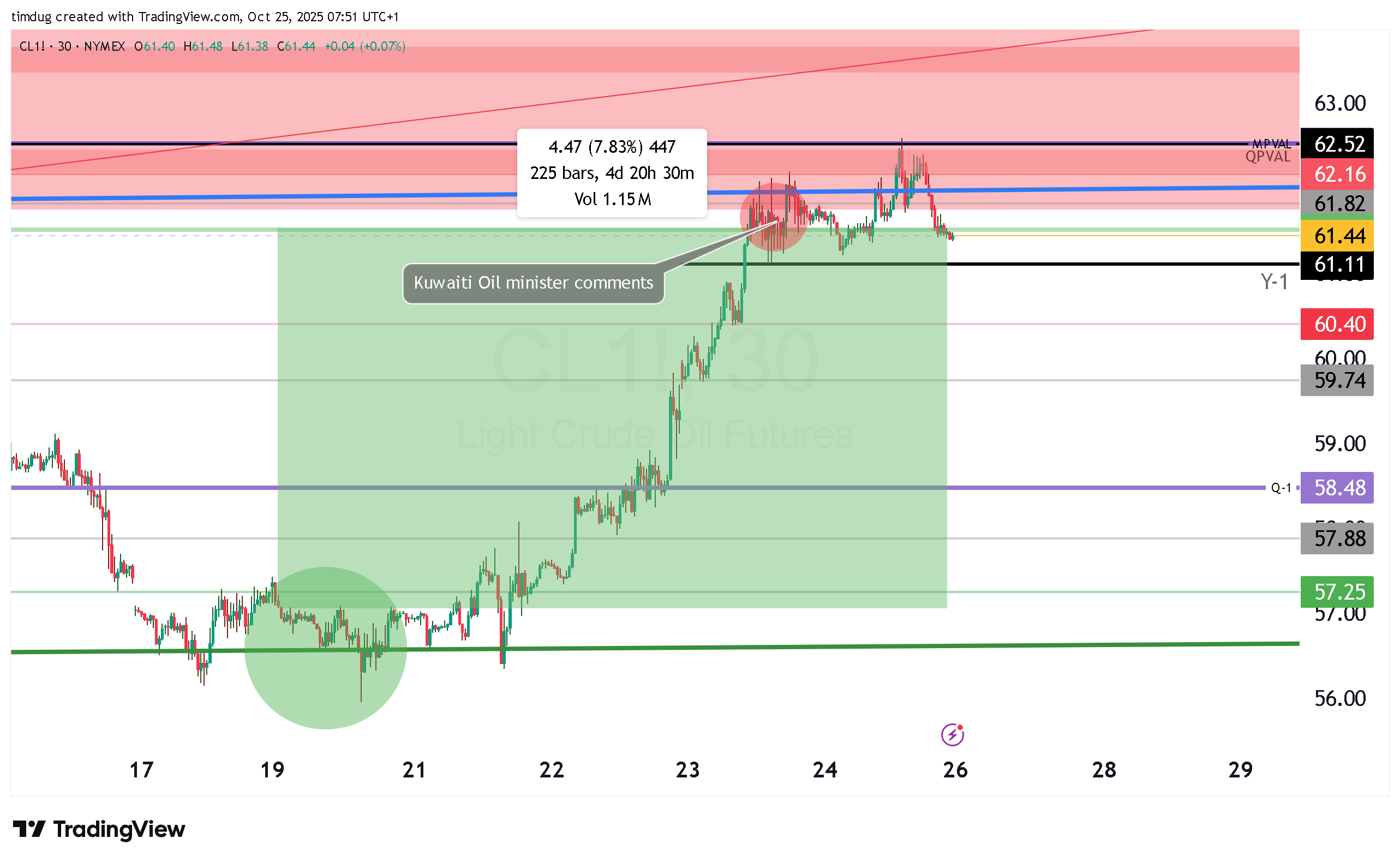 Bulls have the wind at their backs for now, but I’m fading it. The rally rests on thin ground, and if WTI can’t hold the Y-1 level at $61.11, fresh lows on the year are likely. Positioning remains stretched, sentiment frothy, and Trump’s sanctions-driven spike looks more like headline heat than real demand.
