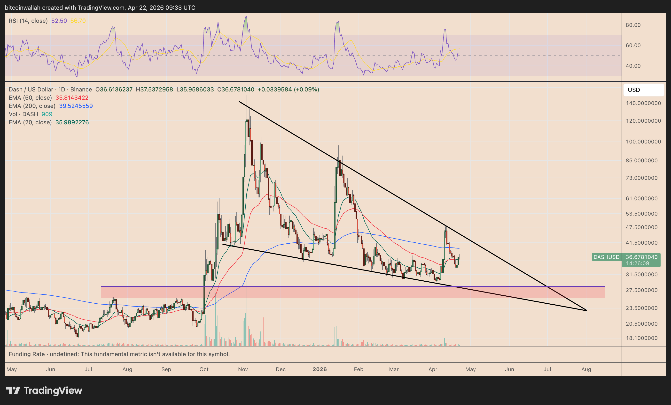 Dash remains trapped inside a large falling wedge, with price turning lower after rejecting the pattern’s upper trendline resistance. This reaction reinforces the broader downtrend structure, suggesting sellers are still active on rallies.