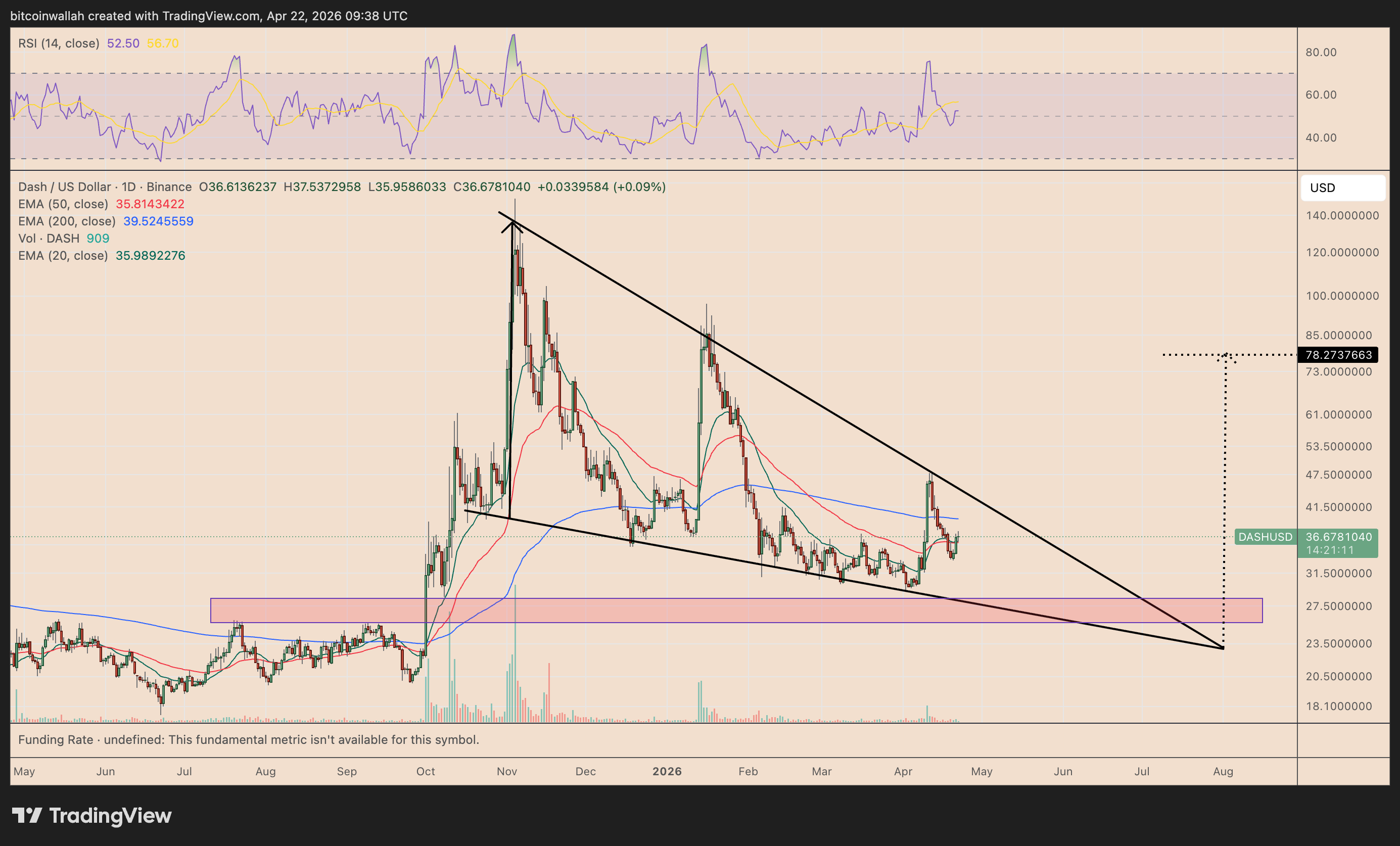 A decisive breakout above the wedge’s upper trendline may send DASH’s price to around $79, assuming the breakout originates at the structure’s apex point, where the two trendlines converge.