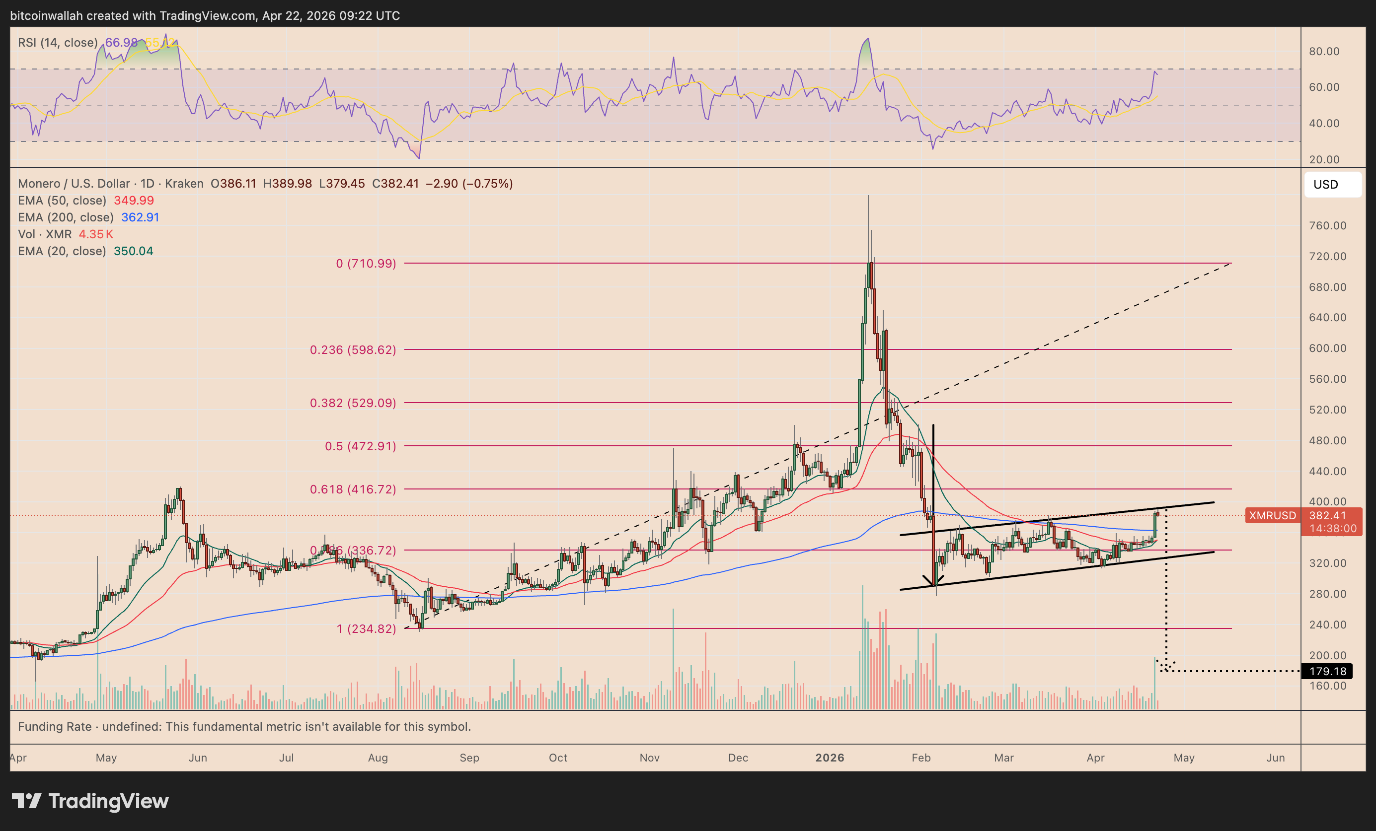 In that case, the next downside target appears near $180, implying a drop of more than 50% from current levels and marking a full unwinding of Monero’s post-breakout gains.