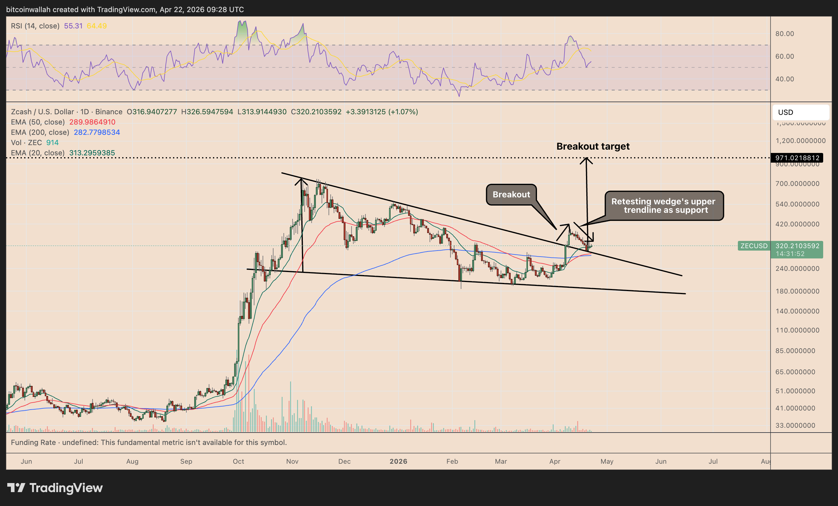 Zcash appears to be breaking out of a multi-month falling wedge, a structure typically associated with bullish reversals after a prolonged downtrend.