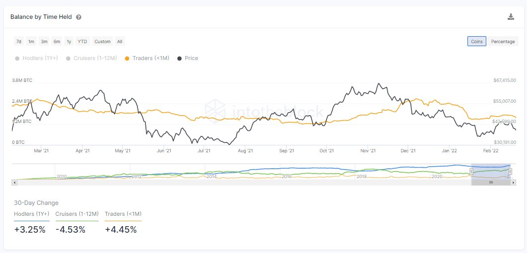 Data from Into The Block highlighted that while ‘long-term holders remain unfazed, the balance held by traders or addresses<1 month, is moving almost in tandem with the price action.’ Furthermore, since February 14, short-term holders have decreased their holdings by 8.7% to 1.55 million BTC now.