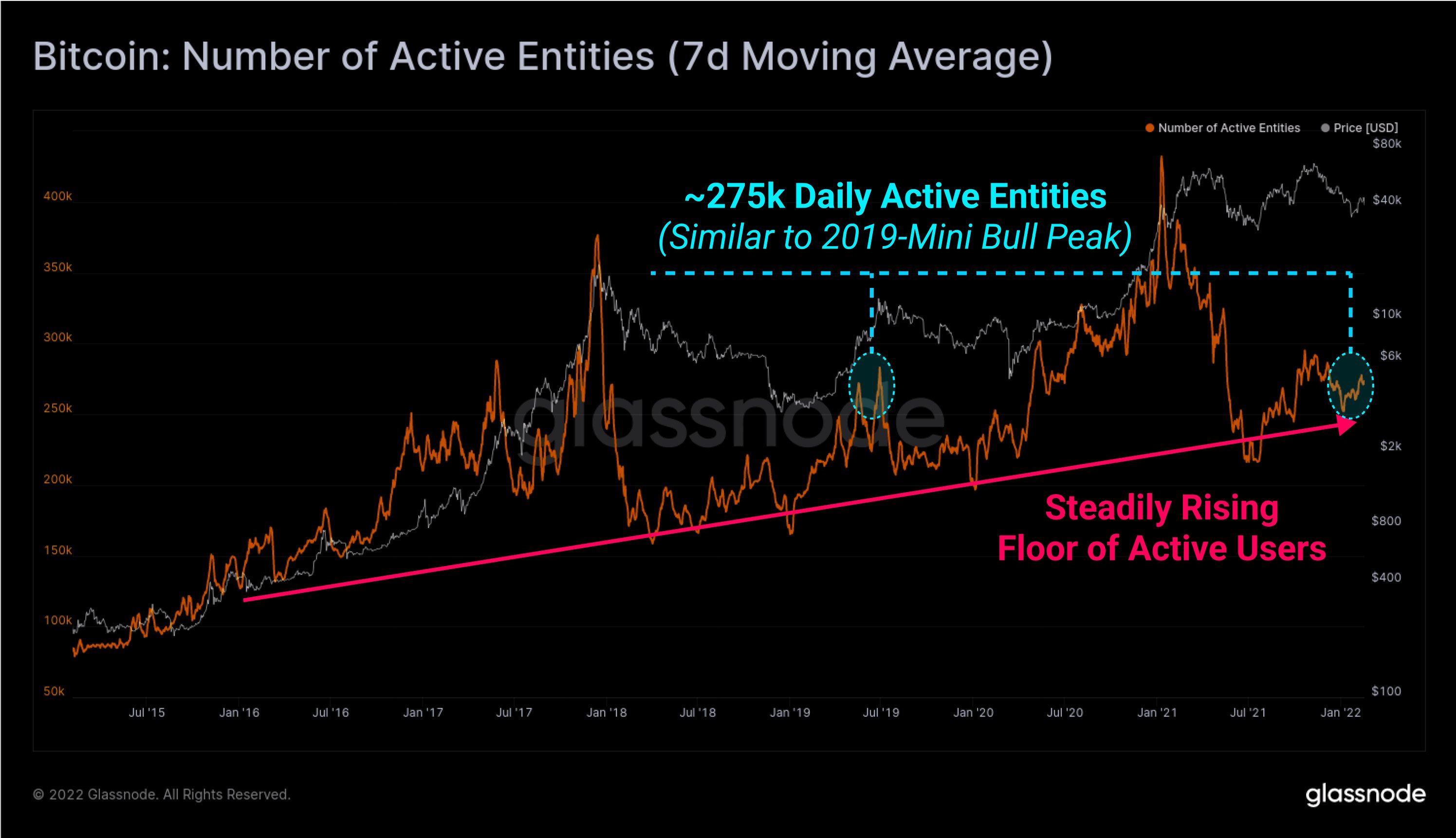 This reduction meant that daily active entities were now noting the same levels as in mid-2019 and even well below the peak of the last halving cycle in December 2017. Nonetheless, the activity floor continues to climb in bearish markets, reflecting longer-term network effects.