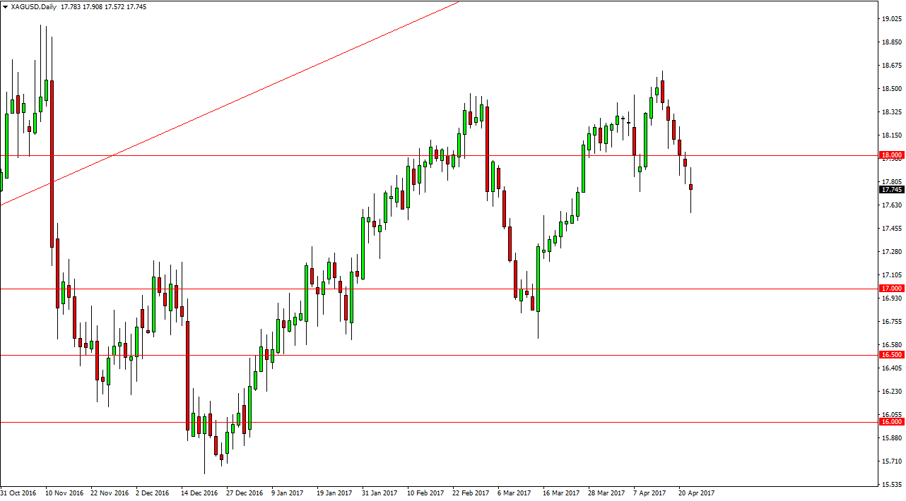 Silver markets had a very volatile session on Monday, as the French election results through a lot of chaos into the marketplace. There was a certain amount of relief, so therefore precious metals sold off during the day. However, it looks as if there is plenty of support just below, so we had formed a candle that suggests that we have a lot of volatility had of us. If we can break above the $18 level, I think that the market will reach towards the $18.50 level. Selling still will face quite a bit of noise underneath.